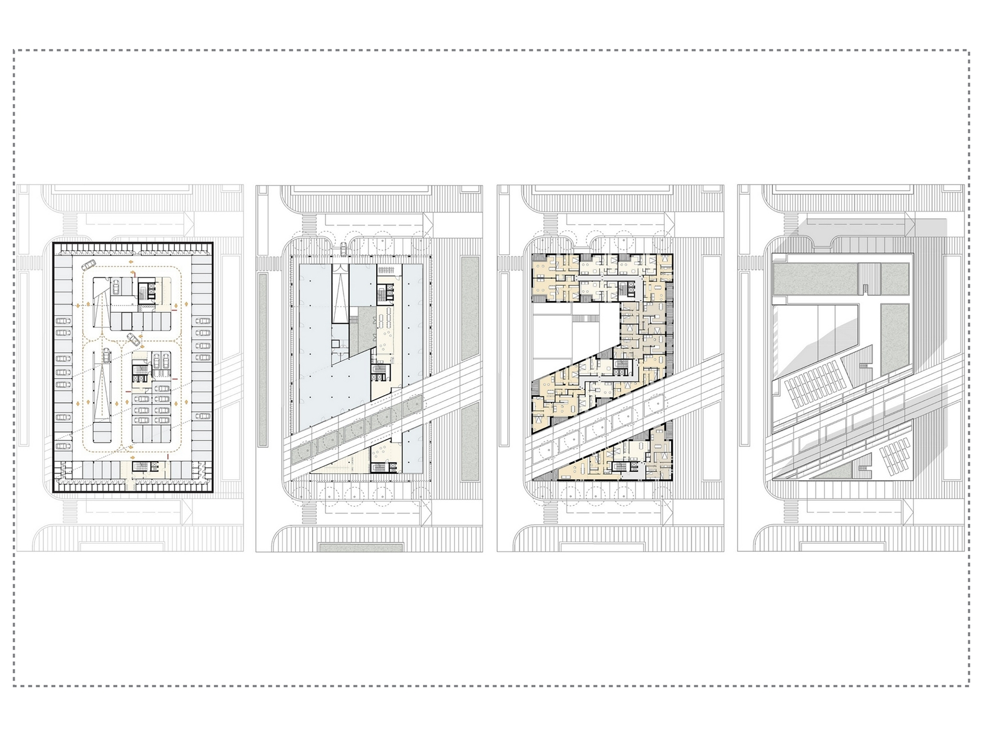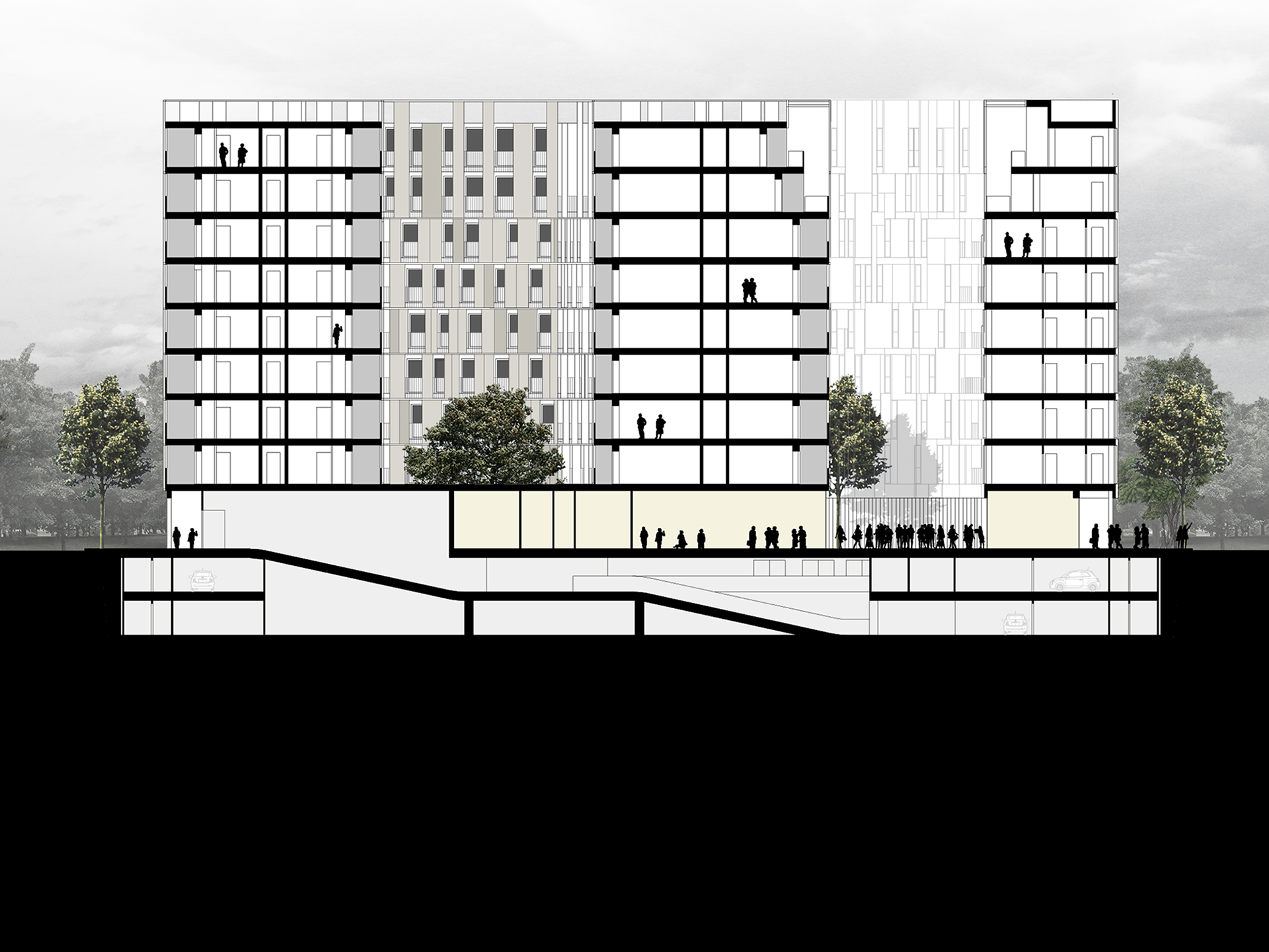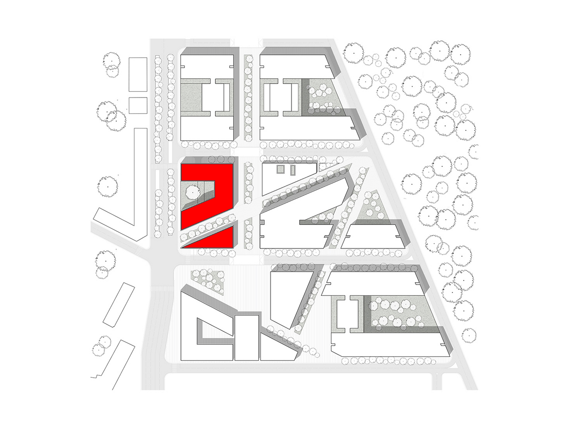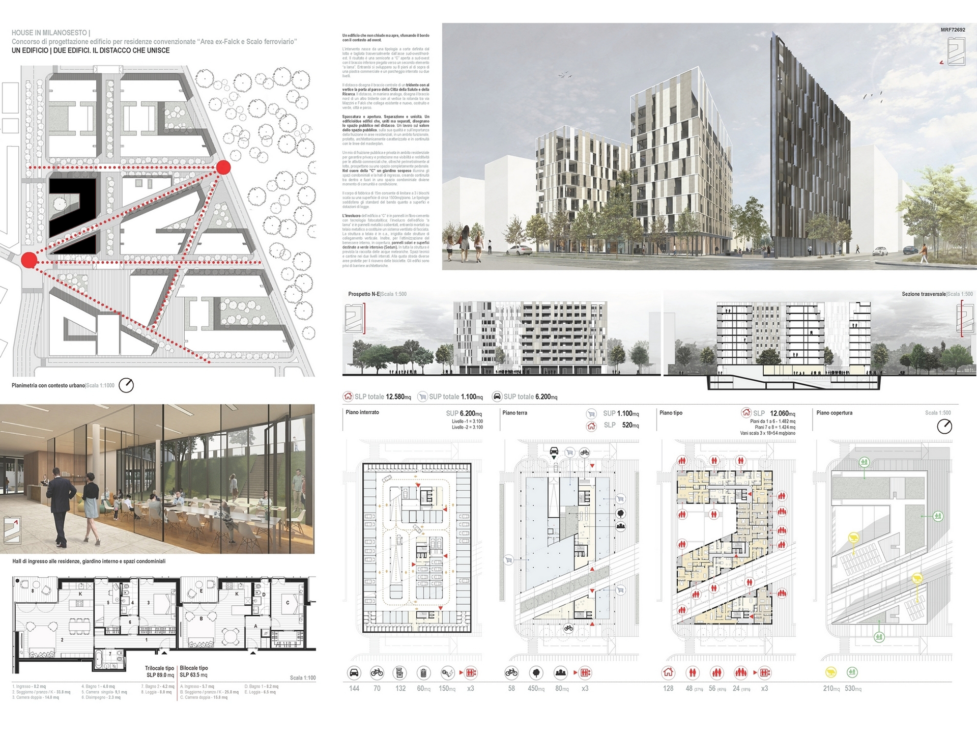 Un edificio. Due edifici. Il distacco che unisce. L’intervento da permeabilità nella direzione est-ovest. Un edificio che, sul lato di via Mazzini, non chiude ma apre, non sottolinea il limite ma sfuma il bordo con il contesto ad ovest. Morfologicamente l’intervento nasce da una tipologia a corte definita dal lotto e tagliata trasversalmente dall’asse sud-ovest/nord-est. Il risultato è una semi-corte a “C” aperta a sud ovest con il braccio inferiore piegato verso un secondo elemento “a lama”. Entrambi si sviluppano su 8 piani residenziali al di sopra di una piastra commerciale e di un parcheggio interrato su due livelli. Il distacco disegna il braccio centrale di un tridente che trova nel suo vertice la porta al parco della Città della Salute e della Ricerca. Il distacco, in maniera analoga, disegna il braccio nord di un altro tridente con al vertice la rotonda tra via Mazzini e Falck che diviene contatto tra esistente e nuovo, tra costruito e verde, tra città e parco. Spaccatura e apertura. Separazione e unicità. Un edificio/due edifici che, uniti ma separati, disegnano lo spazio pubblico all’interno del loro distacco. Un lavoro sul valore dello spazio pubblico, sulla sua qualità e sull’importanza della corretta fruizione anche in situazioni residenziali, suggerendo un ambito chiaro, funzionale, protetto, architettonicamente caratterizzato e in continuità con le linee e gli spazi del masterplan. Una miscela di fruizione pubblica e privata in ambito residenziale per garantire privacy e protezione ma massima visibilità e redditività per le attività commerciali che, oltreché perimetralmente al lotto, prospettano su uno spazio completamente pedonale, calmo e protetto. Una via commerciale che è cannocchiale visivo verso il parco. Nel cuore della “C” un giardino sospeso illumina, attraverso le vetrate, gli spazi condominiali e la hall di ingresso, creando continuità tra dentro e fuori. Lo spazio condominiale diviene momento di comunità e condivisione per gli abitanti del complesso. Il corpo di fabbrica di 15m consente di limitare a 3 il numero dei corpi scala a fronte di una superficie di piano di circa 1500mq. Le tipologie residenziali soddisfano gli standard del bando in termini di superfici e dotazioni di logge. L’involucro dell’edificio a “C” è realizzato in pannelli prefabbricati in fibro-cemento, con tecnologia TX Active (principio attivo fotocatalitico); l’involucro dell’edificio “a lama” è realizzato in pannelli metallici accoppiati a materiale coibente, in entrambi i casi montati su telaio metallico a costituire un sistema ventilato di facciata. La struttura a telaio è realizzata in c.a., irrigidita dalle strutture di collegamento verticale. Tra le altre soluzioni tecnologiche proposte per l’ottimizzazione del benessere interno, in copertura, sono presenti pannelli solari e ampie superfici destinate a verde intensivo per un’ottimale coibentazione. Il progetto ha ottenuto la menzione della giuria. Con RGAstudio e Arch. Daniele Zerbi.