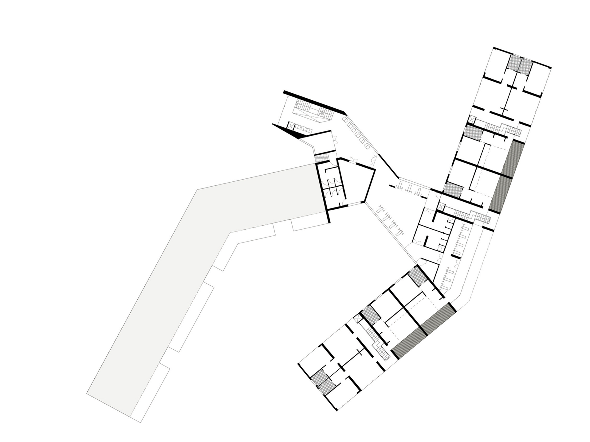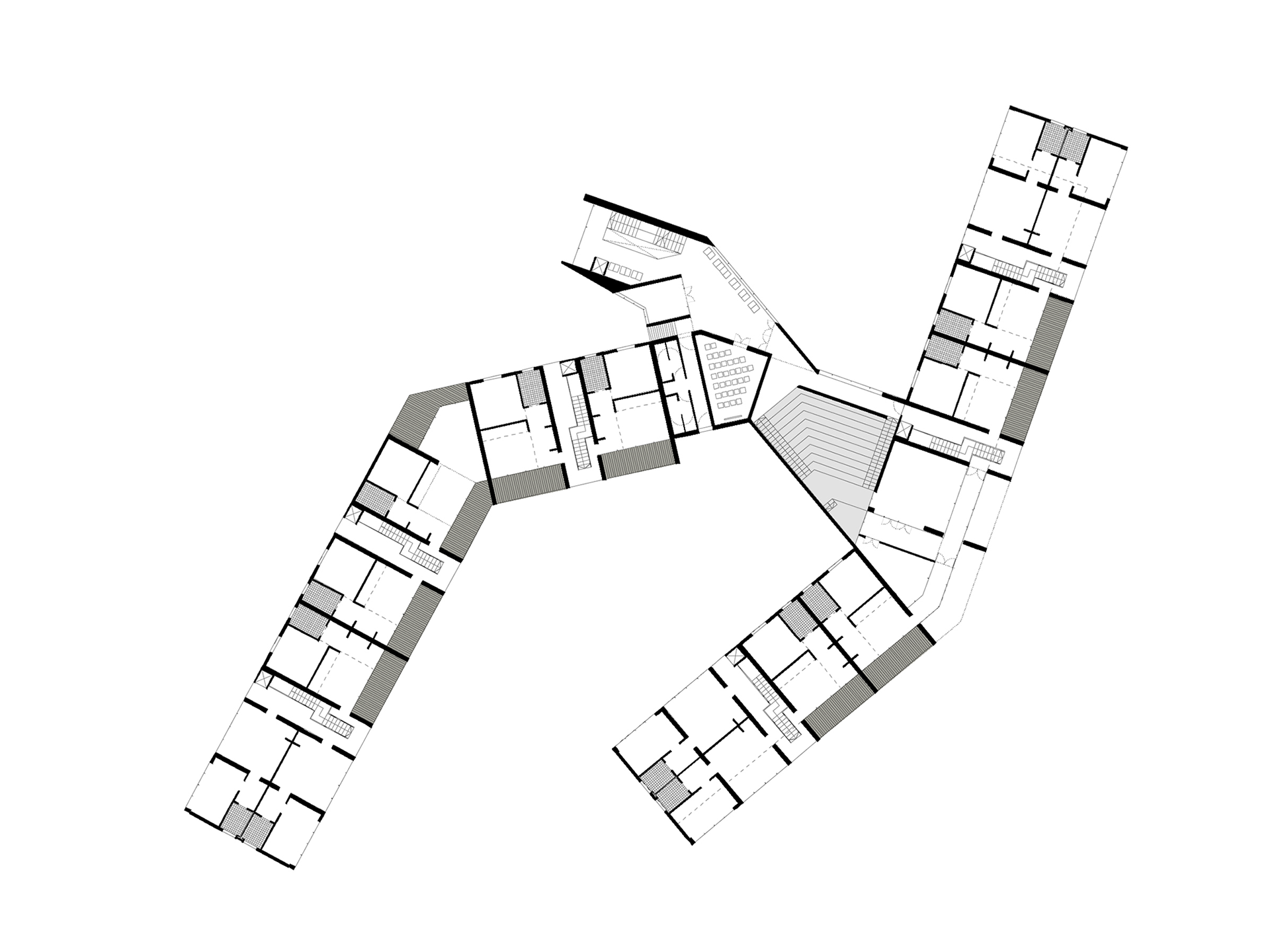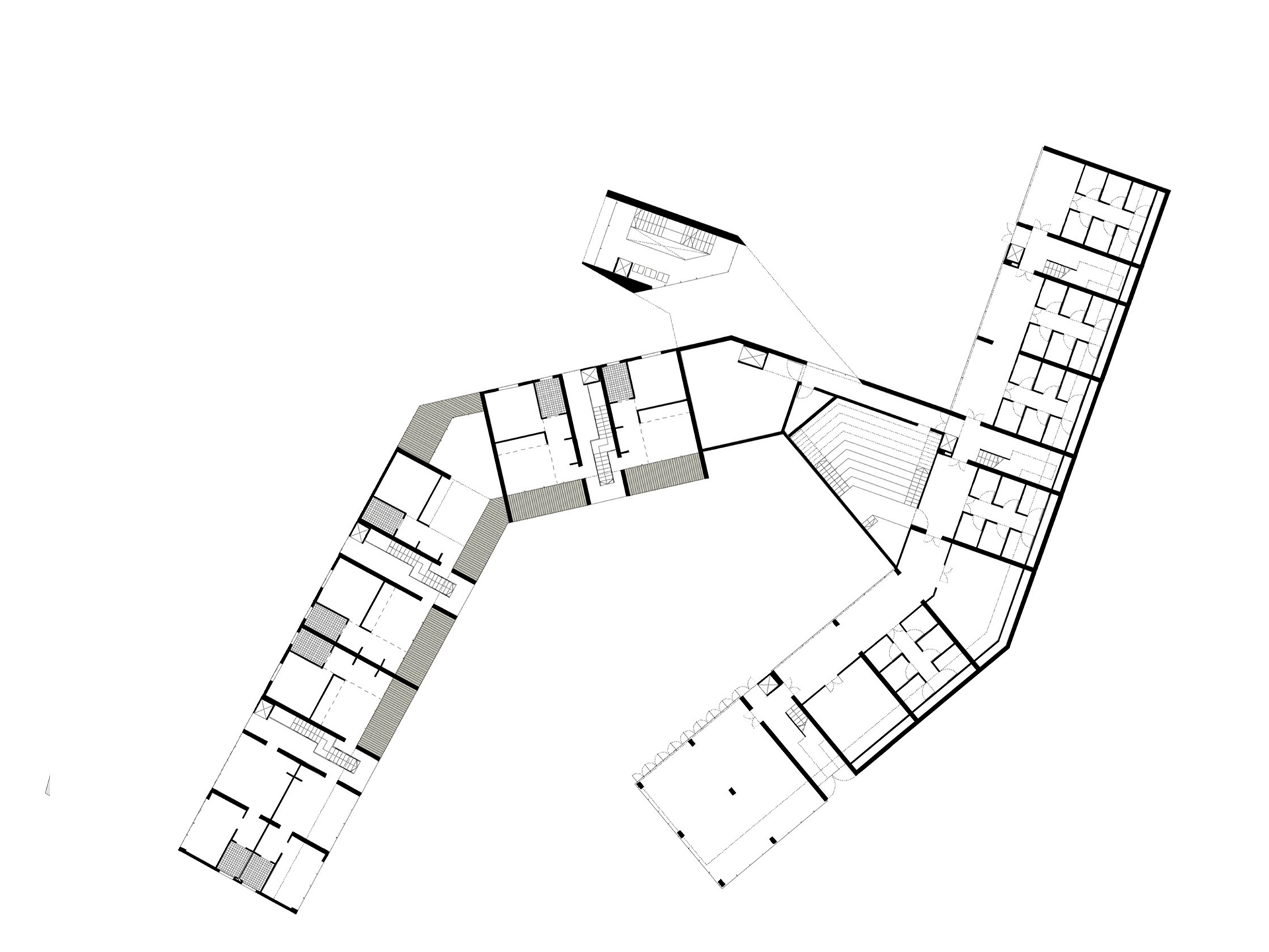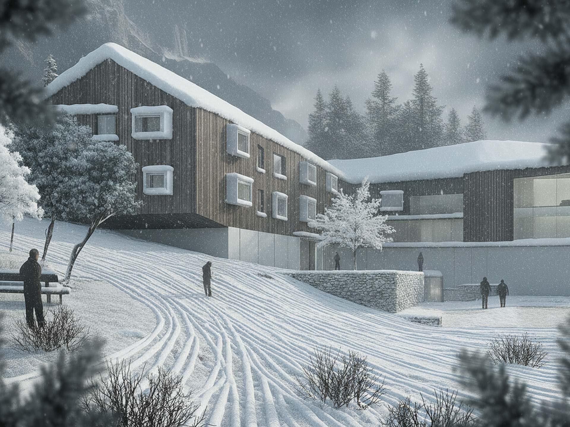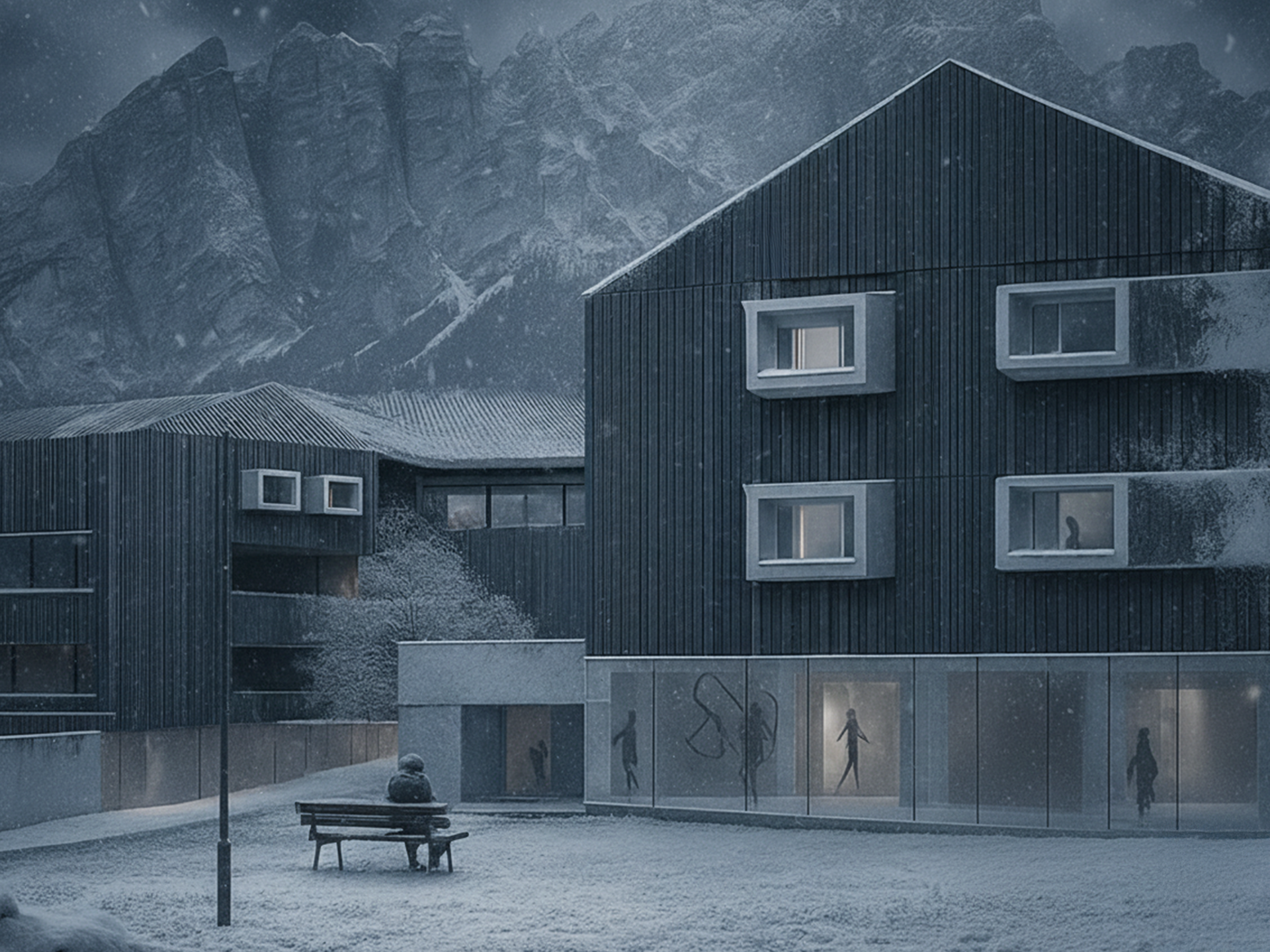 Il progetto sorge a Cortina d’Ampezzo in un’area in lieve pendenza. L’impianto planimetrico si ispira alla forma di una “H”: i bracci longitudinali ospitano le residenze, mentre l’elemento trasversale accoglie gli spazi comuni. A nord si trova l’ingresso principale, collegato alla viabilità e al parcheggio esistenti; a sud, invece, la disposizione abbraccia una corte protetta che offre riparo dal vento e migliora il microclima. I bracci laterali sono piegati per ottimizzare l’irraggiamento solare e aprire gli spazi verso sud, mentre il corpo trasversale funge da ponte, collegando i due blocchi e garantendo il passaggio dei mezzi di soccorso. Lo sfalsamento altimetrico dei volumi limita gli sbancamenti e consente di contenere l’altezza entro i limiti normativi. Ai livelli inferiori trovano posto parcheggi coperti, depositi e locali di servizio; ai piani superiori, invece, spazi collettivi come magazzini, sale polifunzionali e aree per il tempo libero. Gli appartamenti, orientati prevalentemente est/ovest, beneficiano del doppio affaccio e di logge panoramiche. Sono serviti da corpi scala indipendenti che creano piccole comunità di residenti, offrendo maggiore autonomia rispetto a un unico ingresso centralizzato. Il complesso è arricchito da spazi comuni quali wintergarten, sale hobby, cucina, palestra con ampie vetrate, cappella e ambulatorio medico. La copertura a falde spezzate dialoga con il profilo montano, integrando l’edificio nel paesaggio. I materiali scelti (legno di cembro, pietra locale, zinco-titanio) ne rafforzano il carattere mimetico e radicato al contesto. L’intero intervento si ispira a criteri di ecosostenibilità, con impianti solari e fotovoltaici, microcogenerazione e sistemi di recupero delle acque. Il progetto intende inserirsi con rispetto nel paesaggio alpino, reinterpretando in chiave contemporanea i valori dell’architettura rurale. La forma articolata richiama i piccoli borghi storici che si raccolgono per proteggersi dal clima, mentre la copertura sfaccettata si fonde con le linee delle montagne. L’opera rispetta le richieste del bando e costituisce la base per futuri sviluppi, in equilibrio tra innovazione, funzionalità e radicamento al contesto.