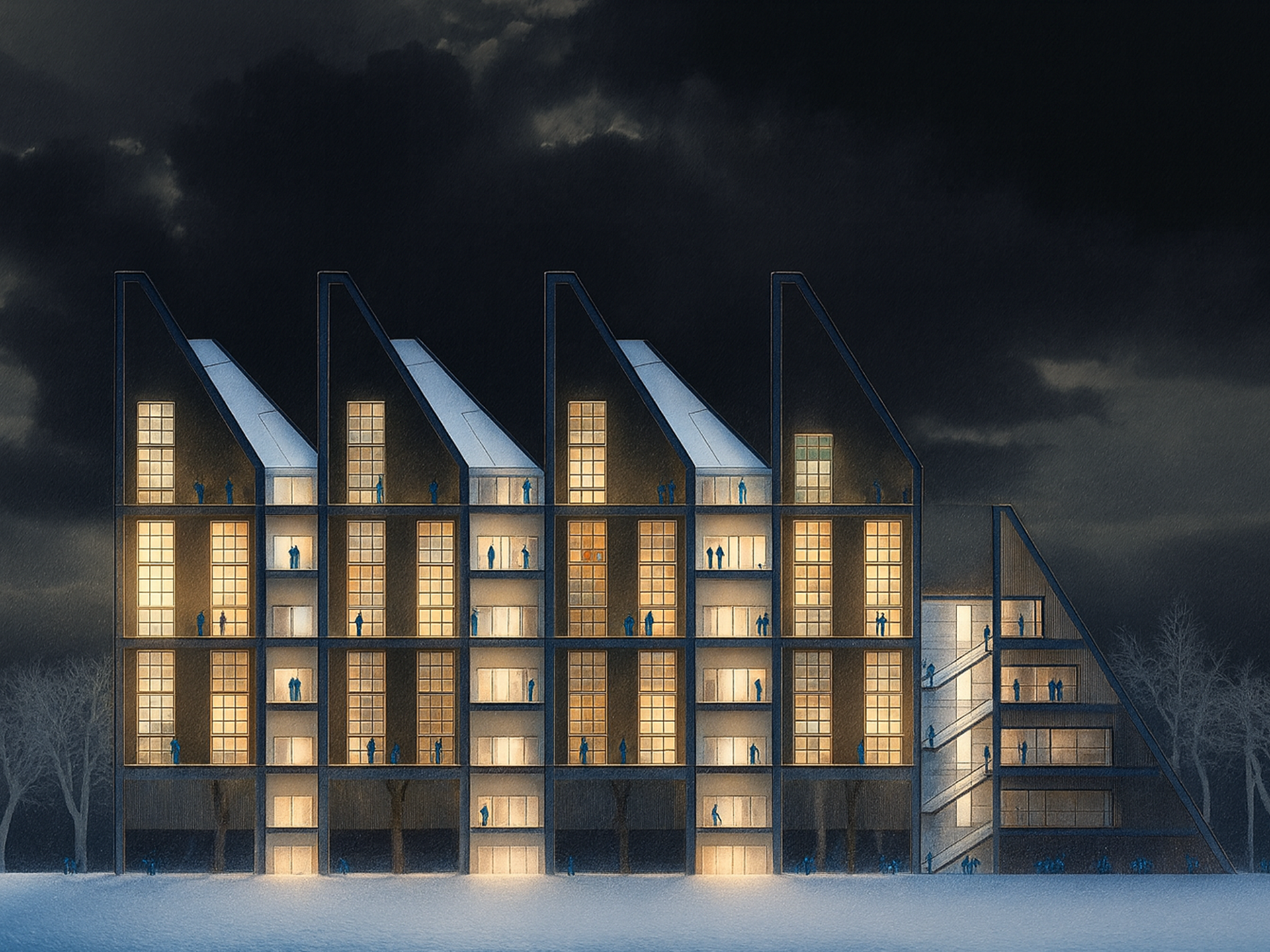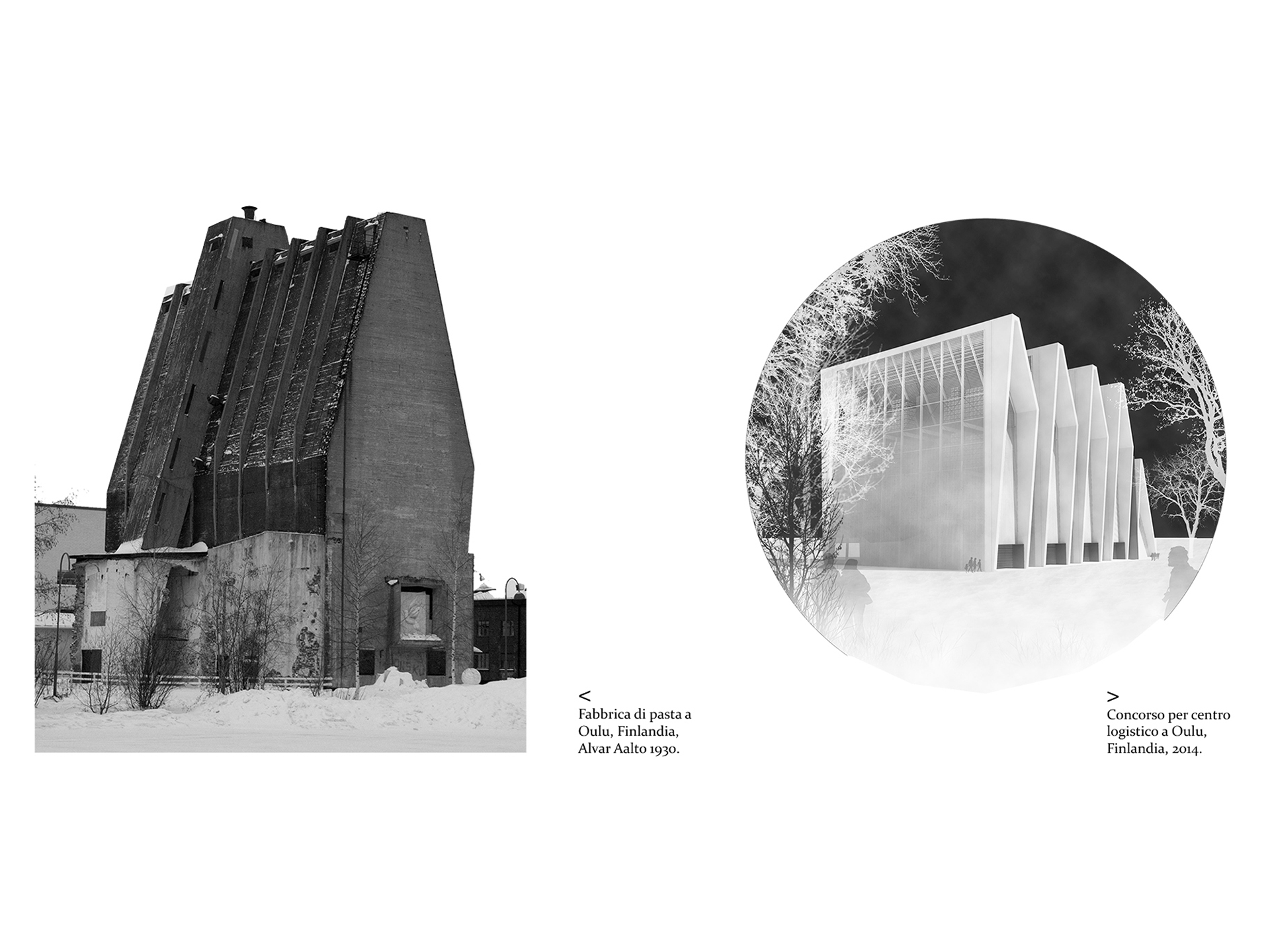 Il riferimento per il progetto di concorso è il primo edificio industriale modernista di Alvar Aalto situato nel quartiere Meri-Toppila di Oulu, in Finlandia. Il silo riflette la filosofia architettonica di Aalto, integrando funzionalità con un'audace visione estetica. Il progetto di concorso propone un nuovo modello per un centro logistico, capace di trasformare un’area industriale oggi segnata da capannoni bassi e anonimi in un landmark urbano riconoscibile. L’idea è di sostituire l’impianto orizzontale tradizionale con un organismo verticale di 60 metri, articolato in quattro livelli. In questo modo si riduce l’impronta sul paesaggio, preservando la natura circostante e introducendo una densità capace di ottimizzare suolo e risorse. Il sistema si compone di moduli di stoccaggio flessibili (da 4 a 8), collegati da una dorsale centrale per la movimentazione. Tre “service box” ospitano ascensori, scale, spazi tecnici e impiantistici, garantendo un flusso efficiente di merci e persone. Ogni modulo integra baie di carico doppie per otto camion complessivi. Un edificio di testata accoglie uffici, hall e spazi per i visitatori, diventando la facciata rappresentativa del complesso. Il risultato è un’architettura visionaria e compatta, in grado di ispirare un nuovo paesaggio urbano, coniugando funzionalità, flessibilità e qualità ambientale. Le parole chiave sono: Densità · Attrattività · Soluzione integrata · Visionarietà · Paesaggio urbano · Flessibilità.