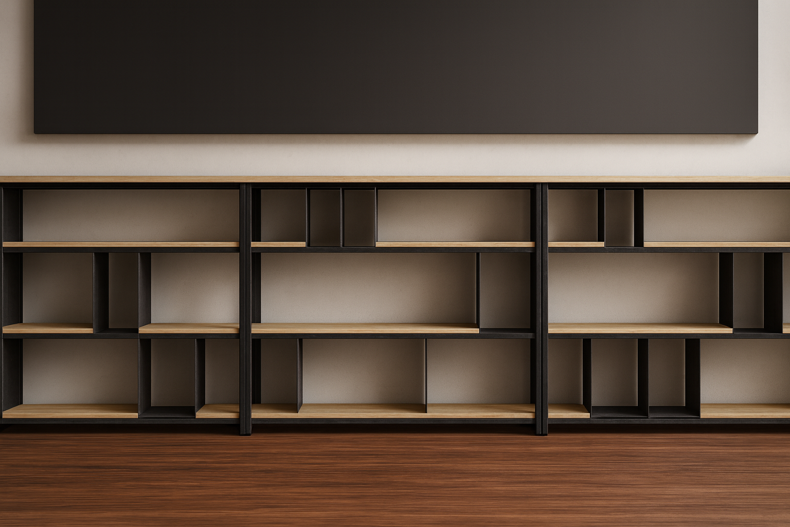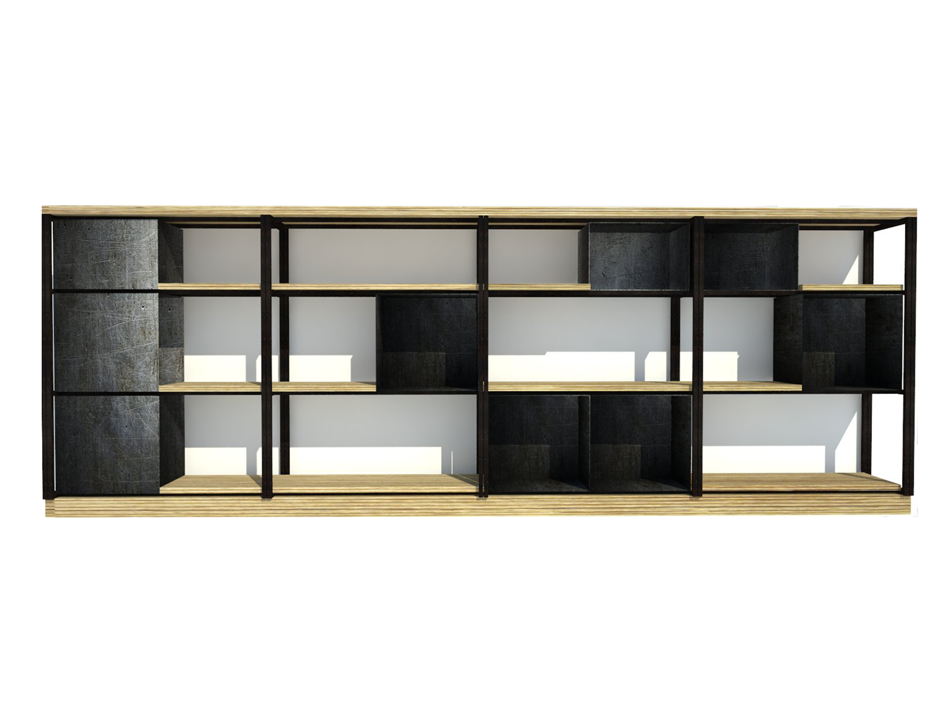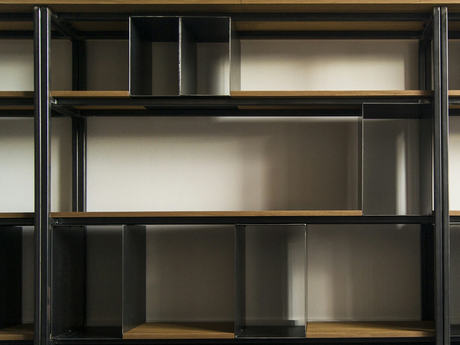 METAL BOX è una libreria che alterna mensole lineari e box di diverse dimensioni, incassati nello spessore dei ripiani in legno naturale. Lunga, bassa e stretta, si regge su una struttura in ferro grezzo cerato, con montanti quadri binati e traversi arretrati. I box di testa, ruotati di 90°, si aprono lateralmente, moltiplicando gli usi. Grezza nei materiali ma elegante nel disegno, sorprende quando si anima di oggetti. Un arredo difficile da catalogare, come la musica dei PIL e del loro disco del 1979: Metal Box.