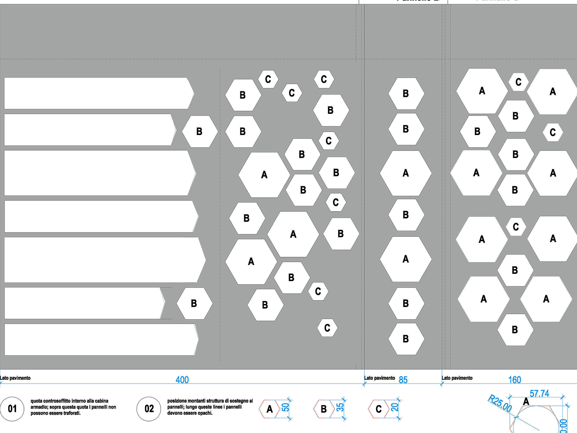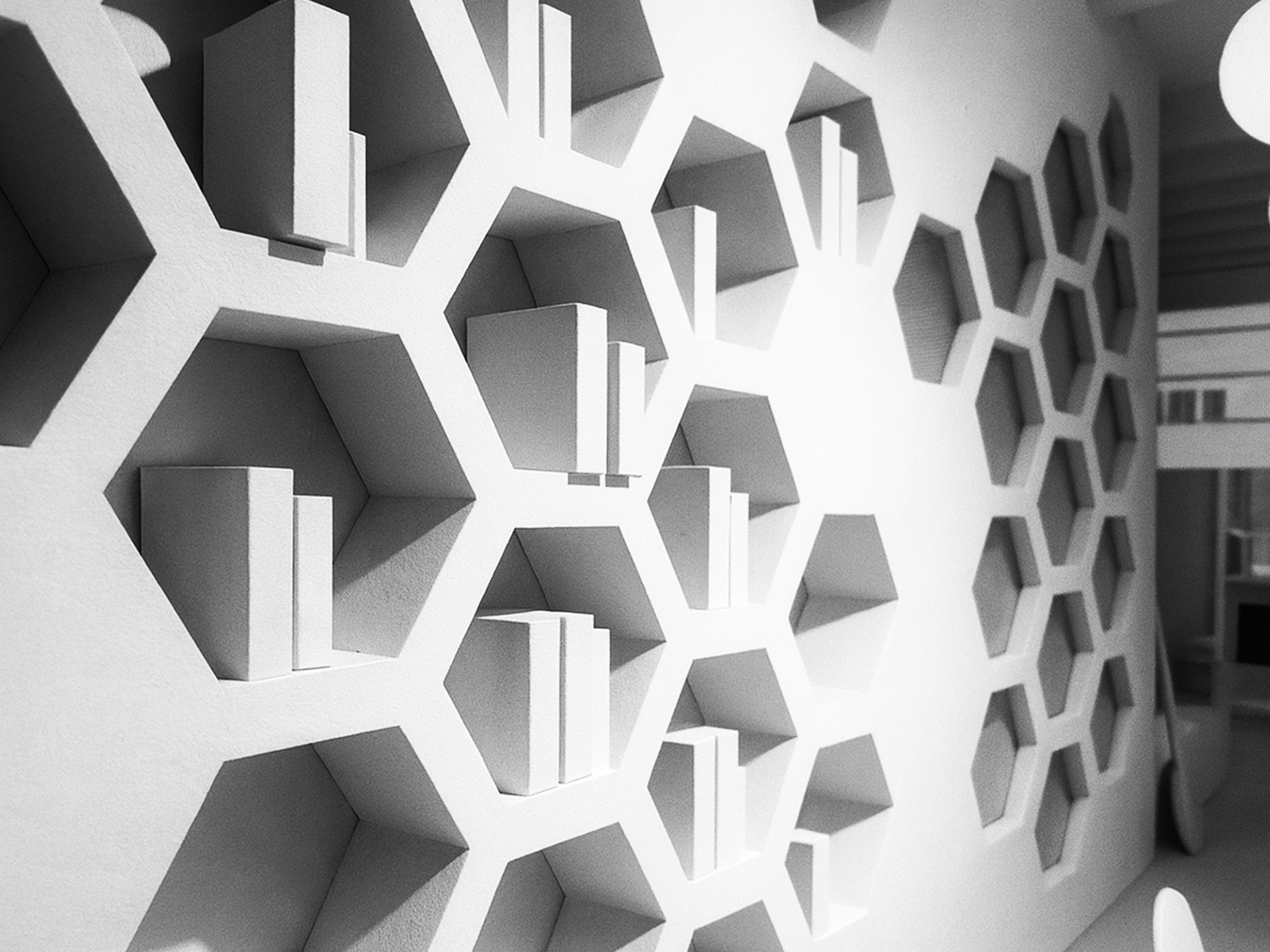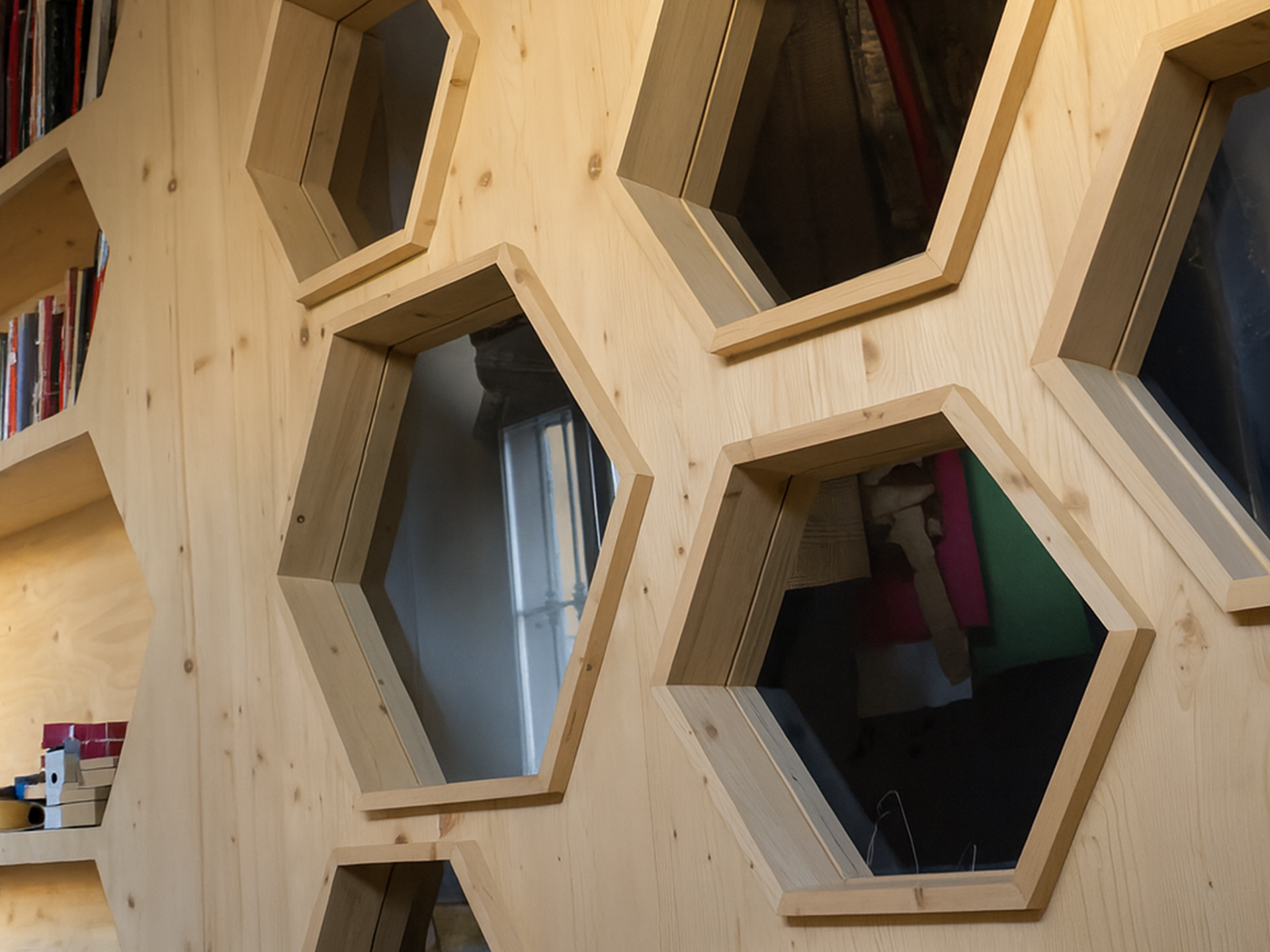 ALVEARE è una cabina armadio pensata per la collezione privata di una designer di moda. Il progetto si ispira al favo delle api, trasformando la maglia esagonale in un sistema di cornici strutturali. Come le api riempiono le cellette di miele, così la stilista custodisce capi unici nel suo nido personale. La struttura, a sandwich in compensato marino e vetro trasparente, si irrobustisce proprio grazie all’esagono, modello naturale di ottimizzazione strutturale. Lo studio del pattern calibra pieni e vuoti, opacità e trasparenze, fino a deformare le cellette in libreria. Di giorno l’oggetto è un caleidoscopio di colori, trame e texture di stoffa che affiorano dagli esagoni; di notte si trasforma in una lampada, proiettando nello spazio una trama mutevole di luci e ombre geometriche