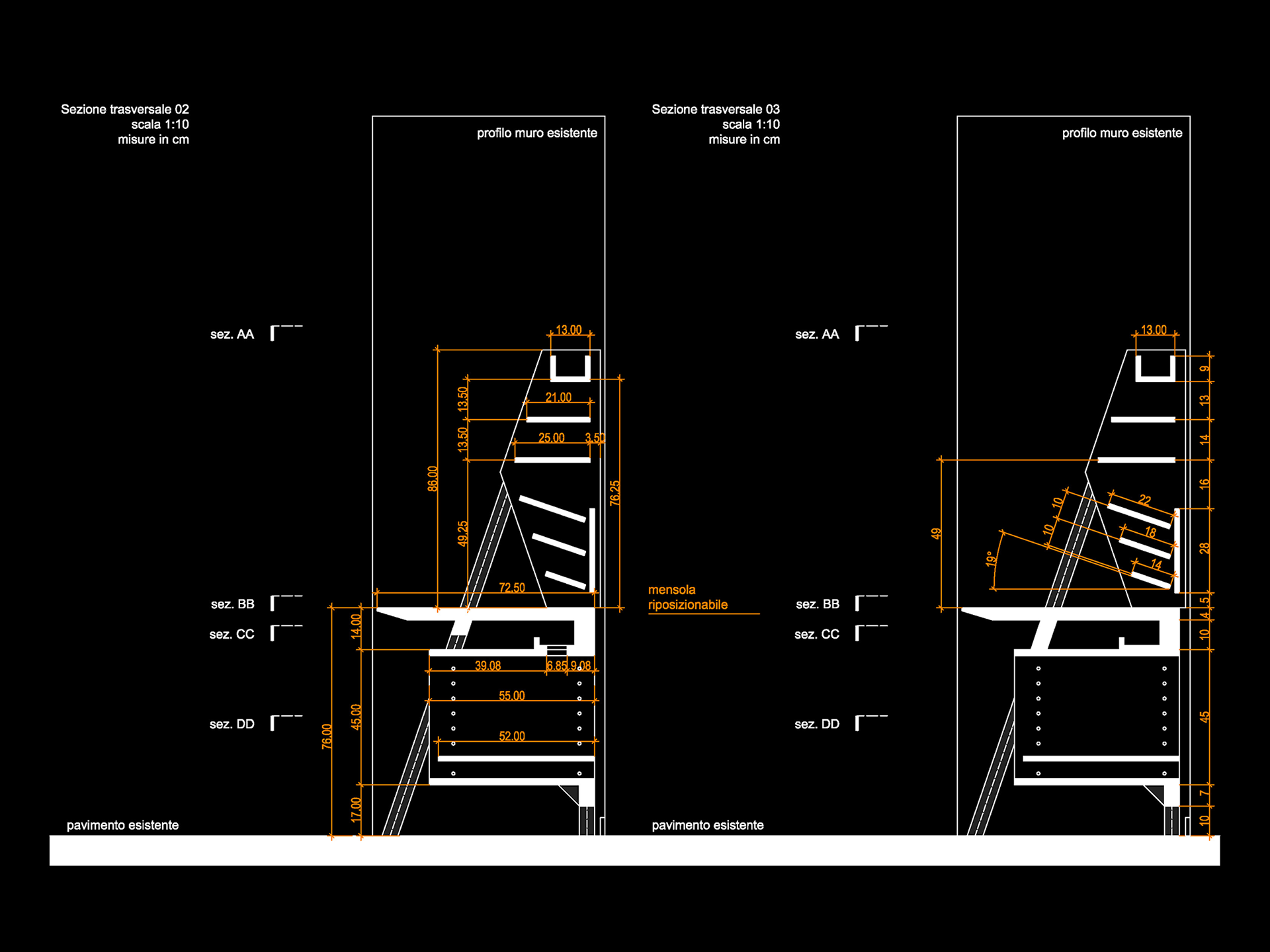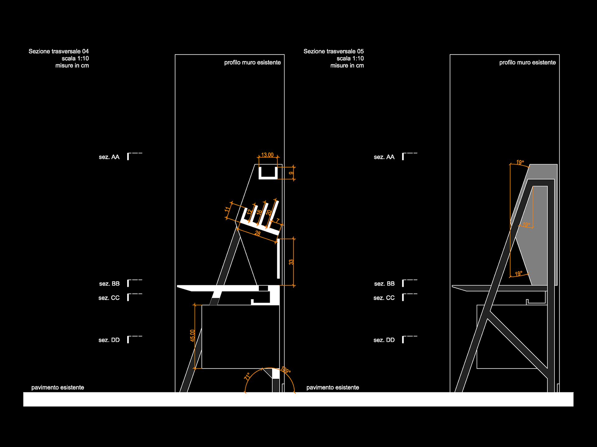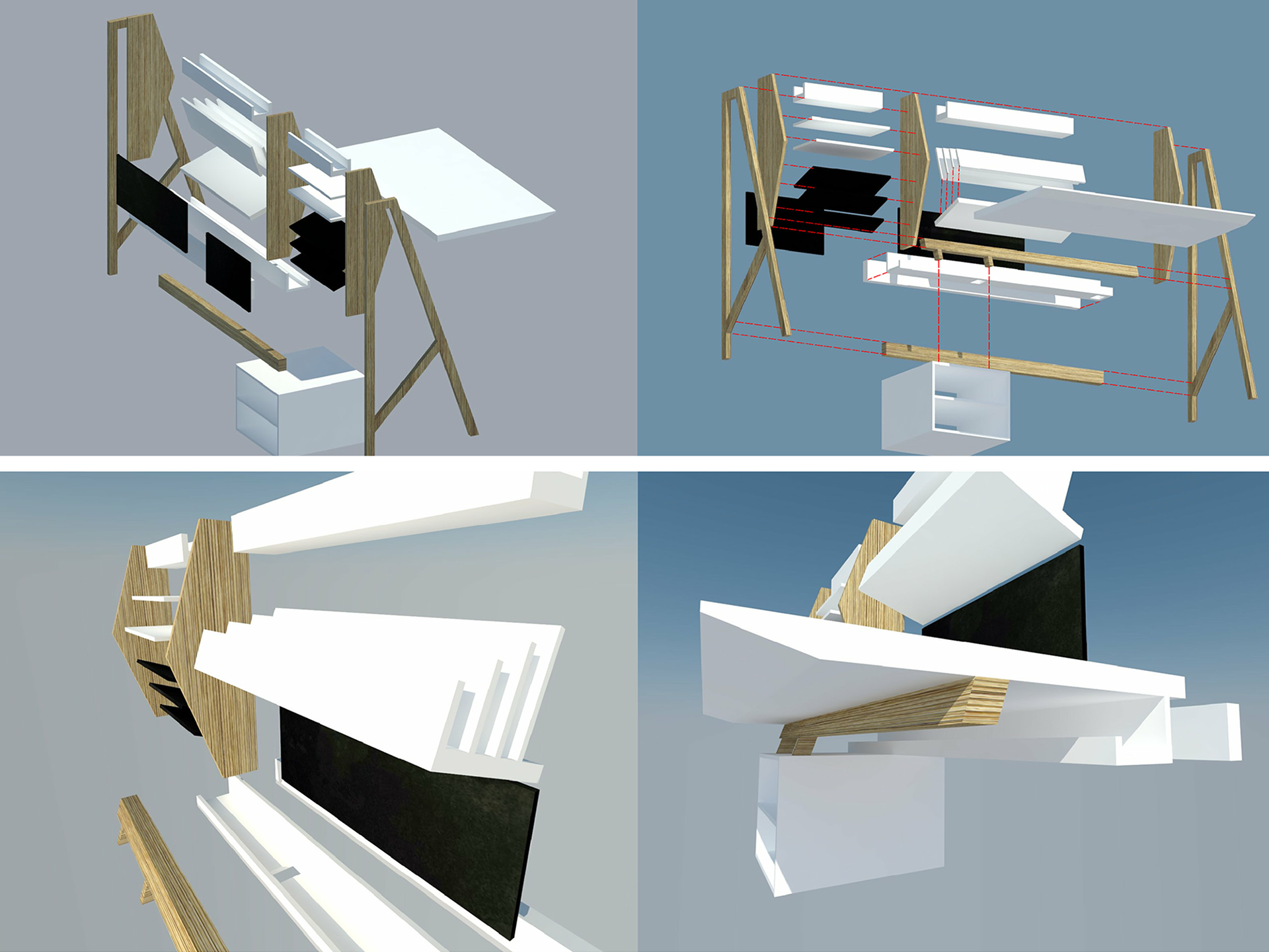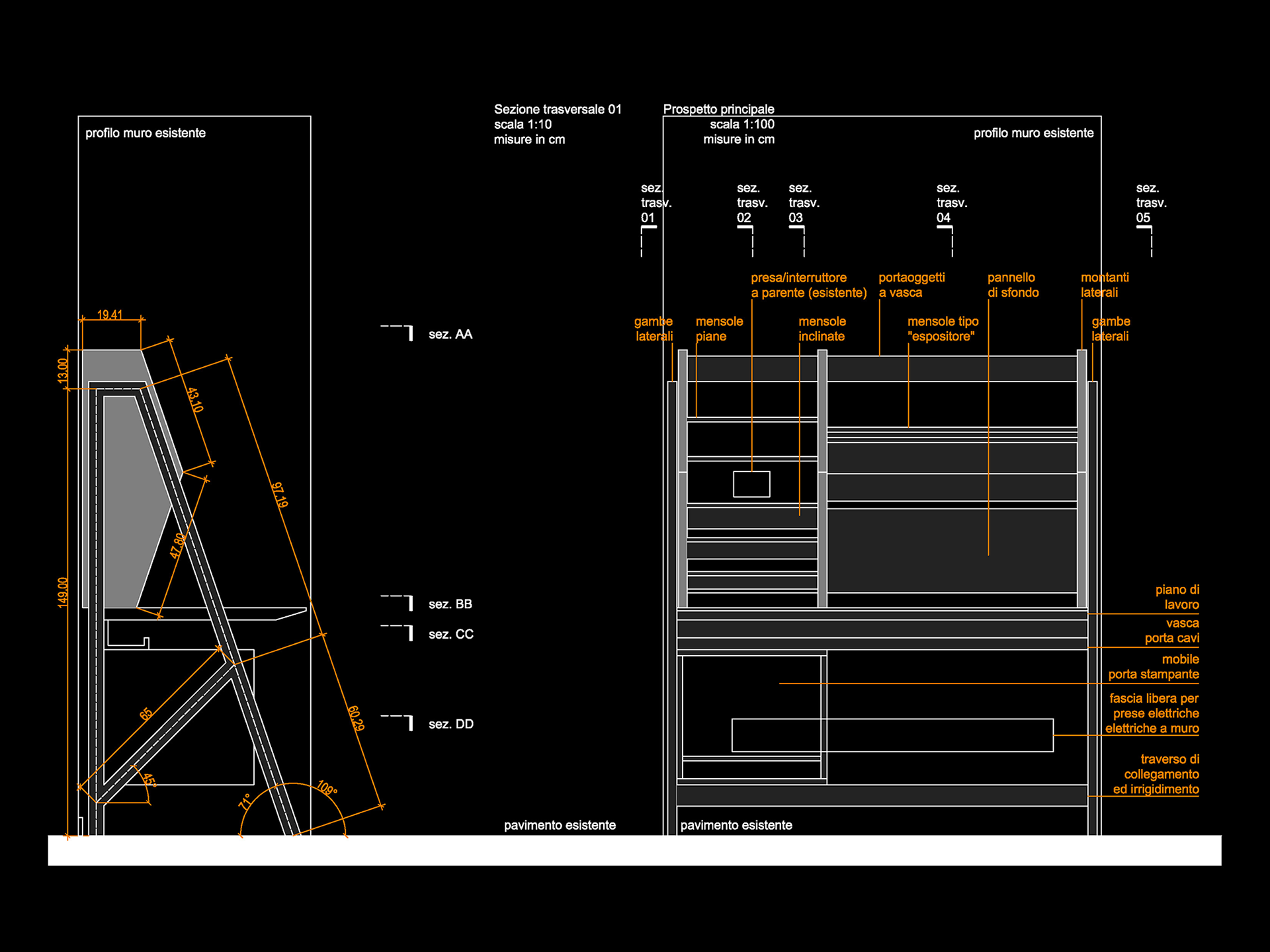 COMPASSO è una scrivania che unisce funzione e carattere: piano di lavoro profondo, mensole con inclinazioni differenti, vaschette porta oggetti e canaline porta cavi nascoste. È pensata per un creativo che alterna digitale, disegno e lettura, raccogliendo in un unico luogo penne, matite e riviste. La parte bassa a destra accoglie un portatile o anche un monitor, mentre in alto un pettine inclinato permette di ordinare riviste di diverse dimensioni, sempre leggibili nel titolo. A sinistra, tre mensole inclinate verso l’interno custodiscono piccoli oggetti senza rischio di caduta. Il disegno a compasso della struttura conferisce leggerezza, trasparenza e una forte personalità.
